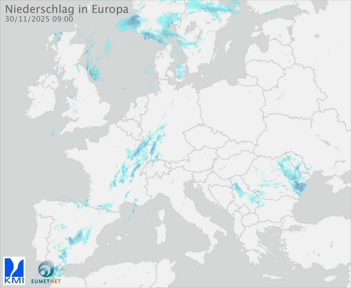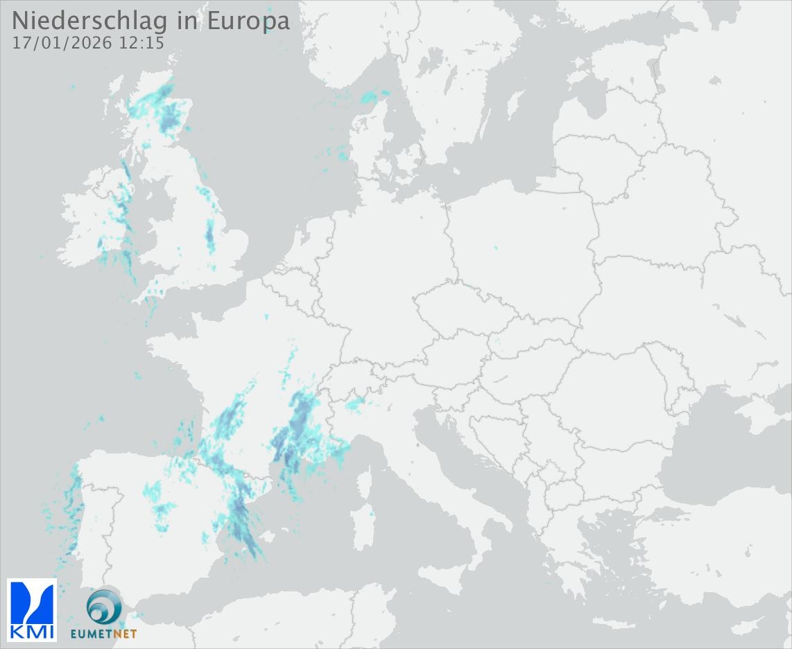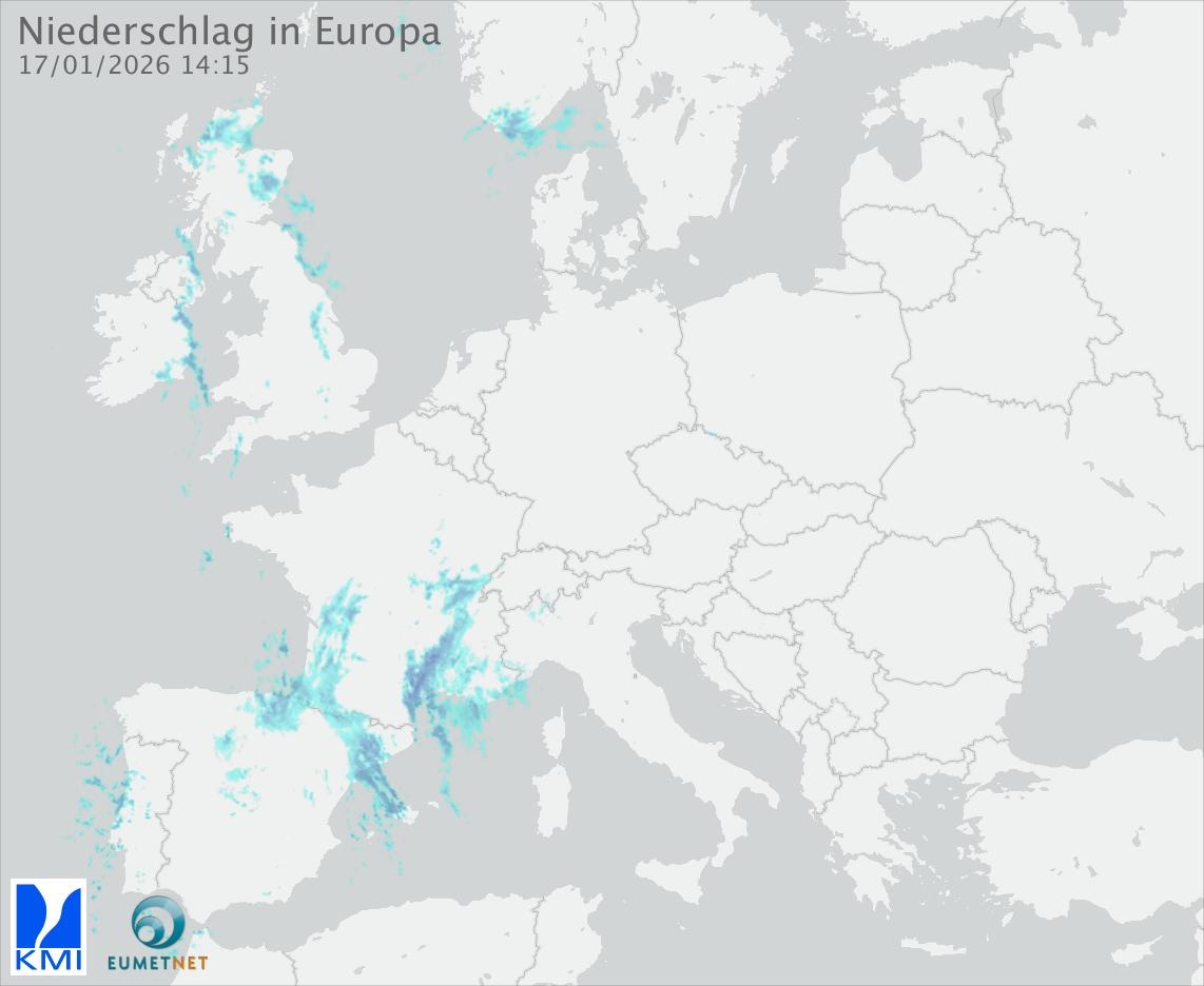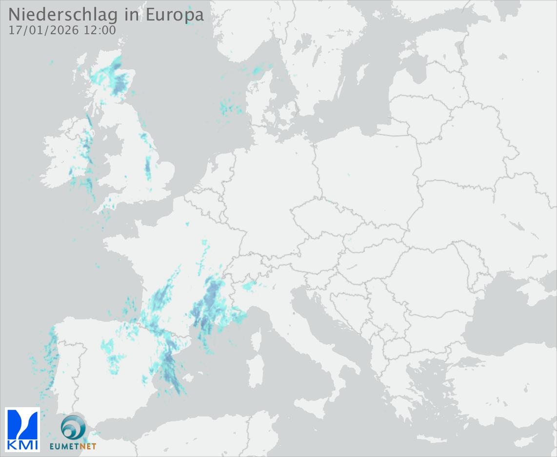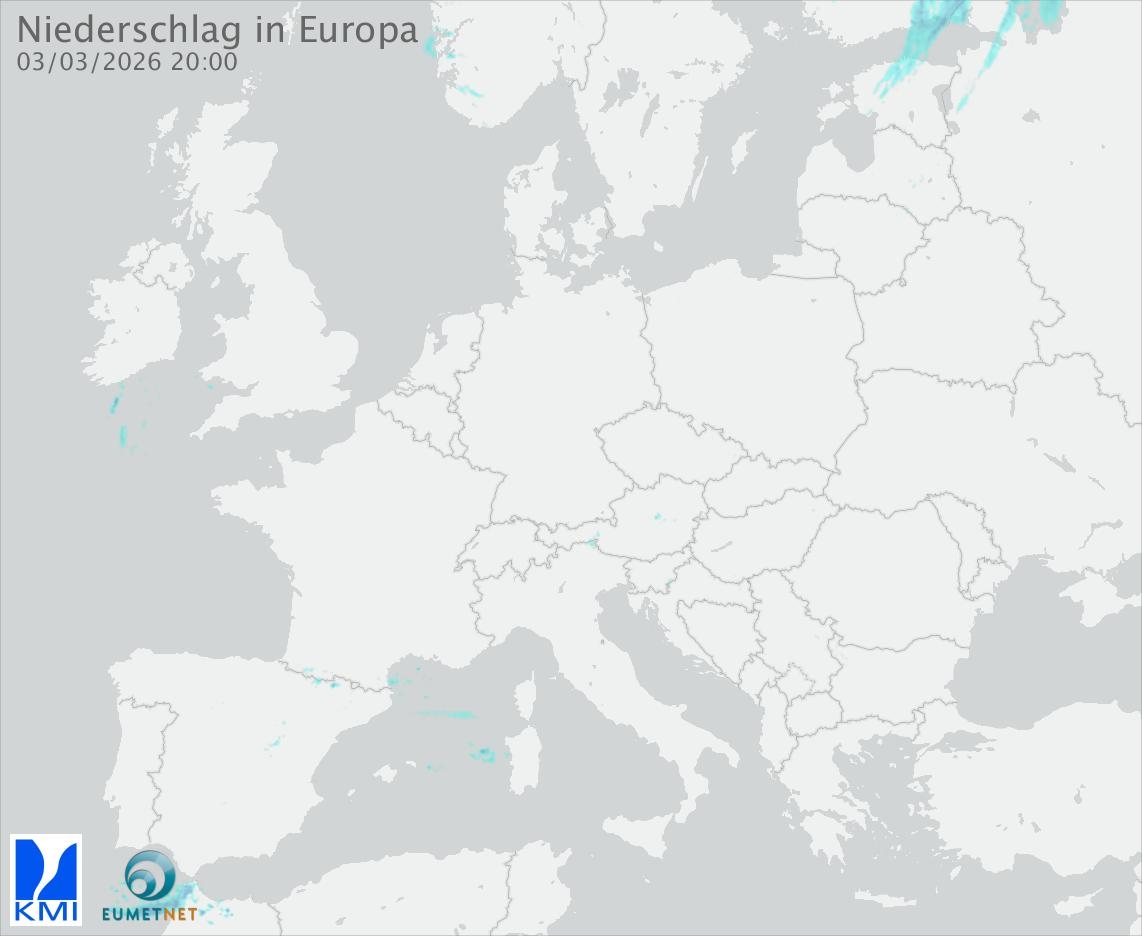 Diese Animation zeigt den gefallenen Niederschlag, gemessen durch die Regenradargeräte der europäischen Teilnehmer des Eumetnet-Programms OPERA (in 15-Minuten-Intervallen).