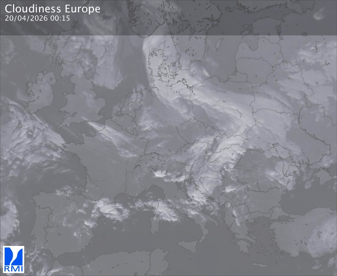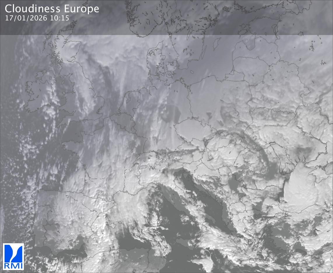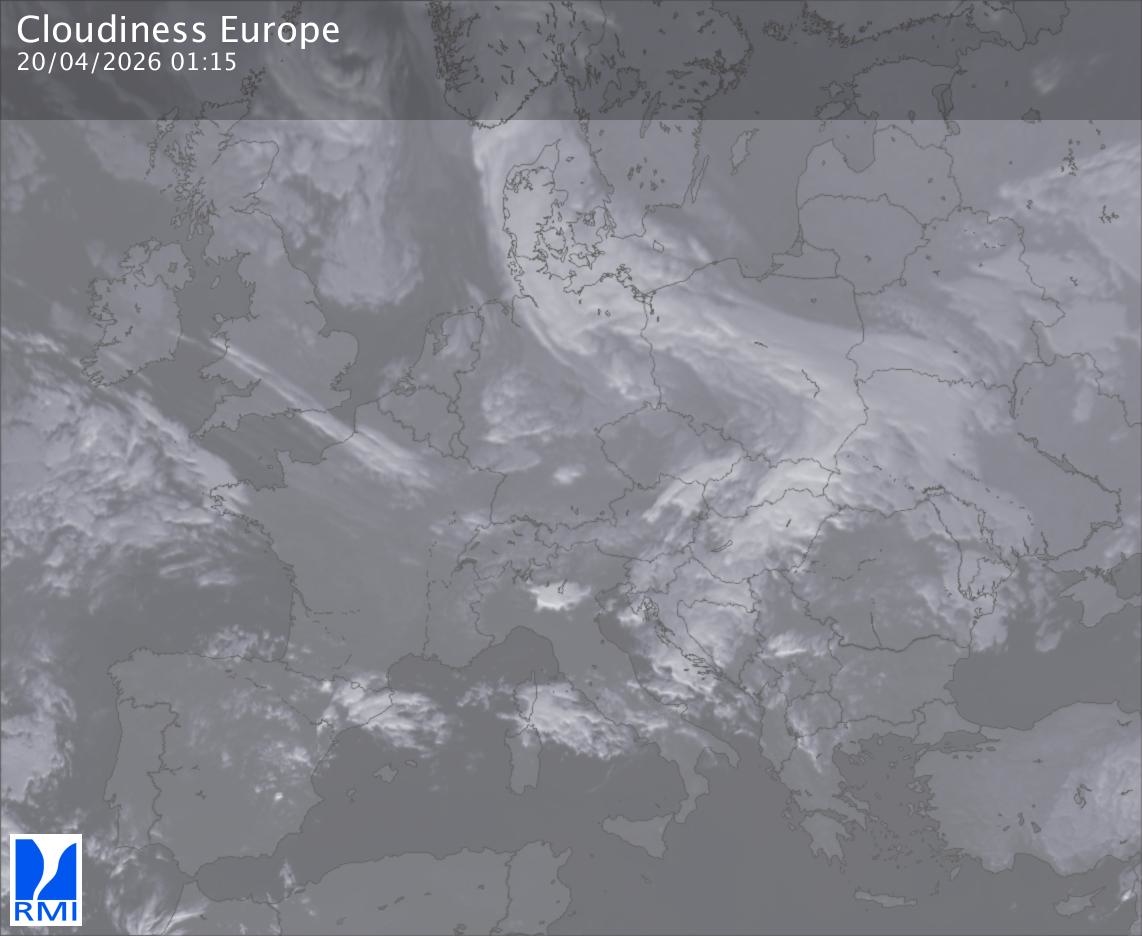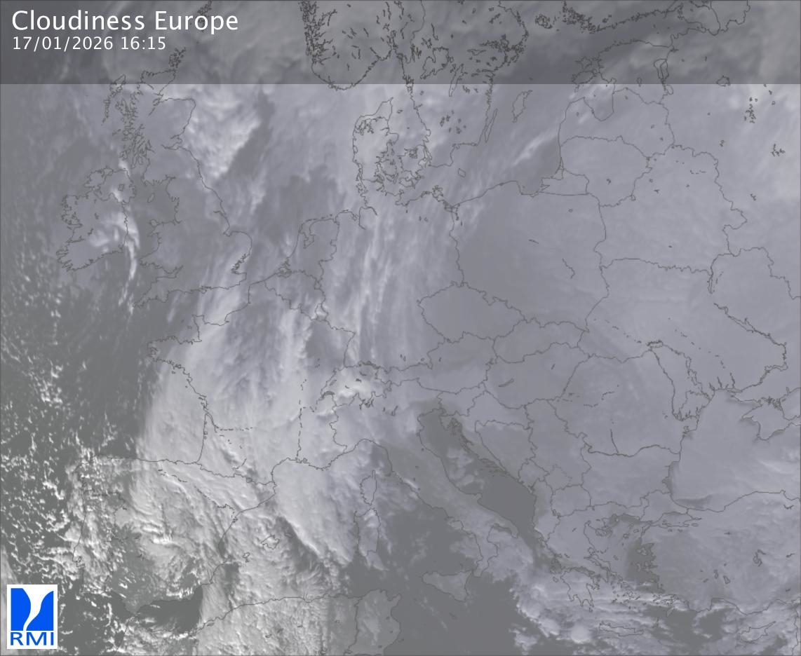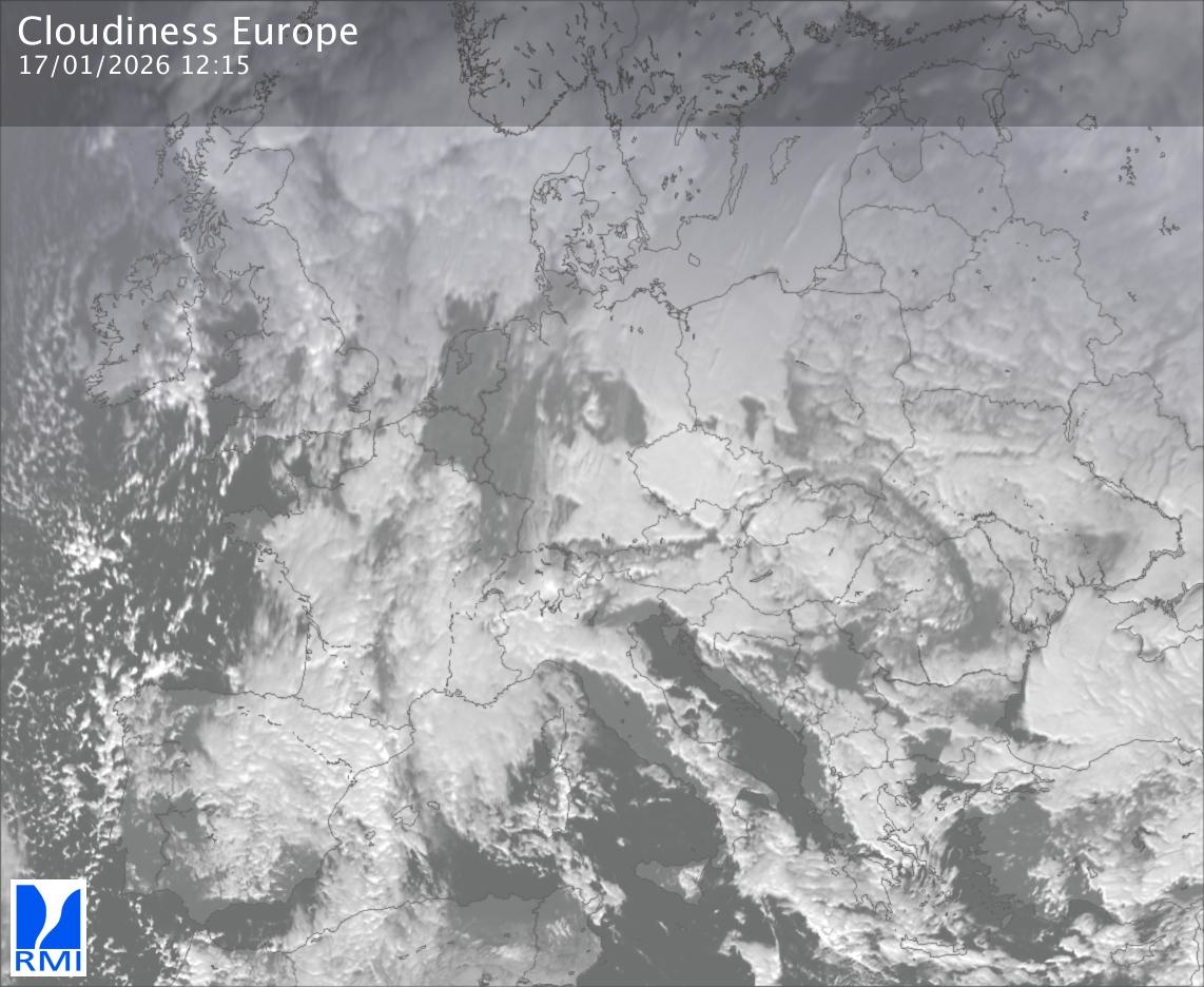 The satellite image of Europe is composed by using both the infrared and the visible light channel from the satellite. Because there are no usable visible light images during the night this composition of channels gives us an image that can be used to observe the clouds by day and by night. The pixelated artifacts are due to the lower resolution of the infrared channel.
