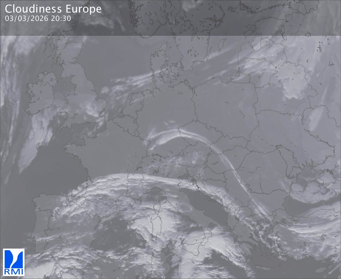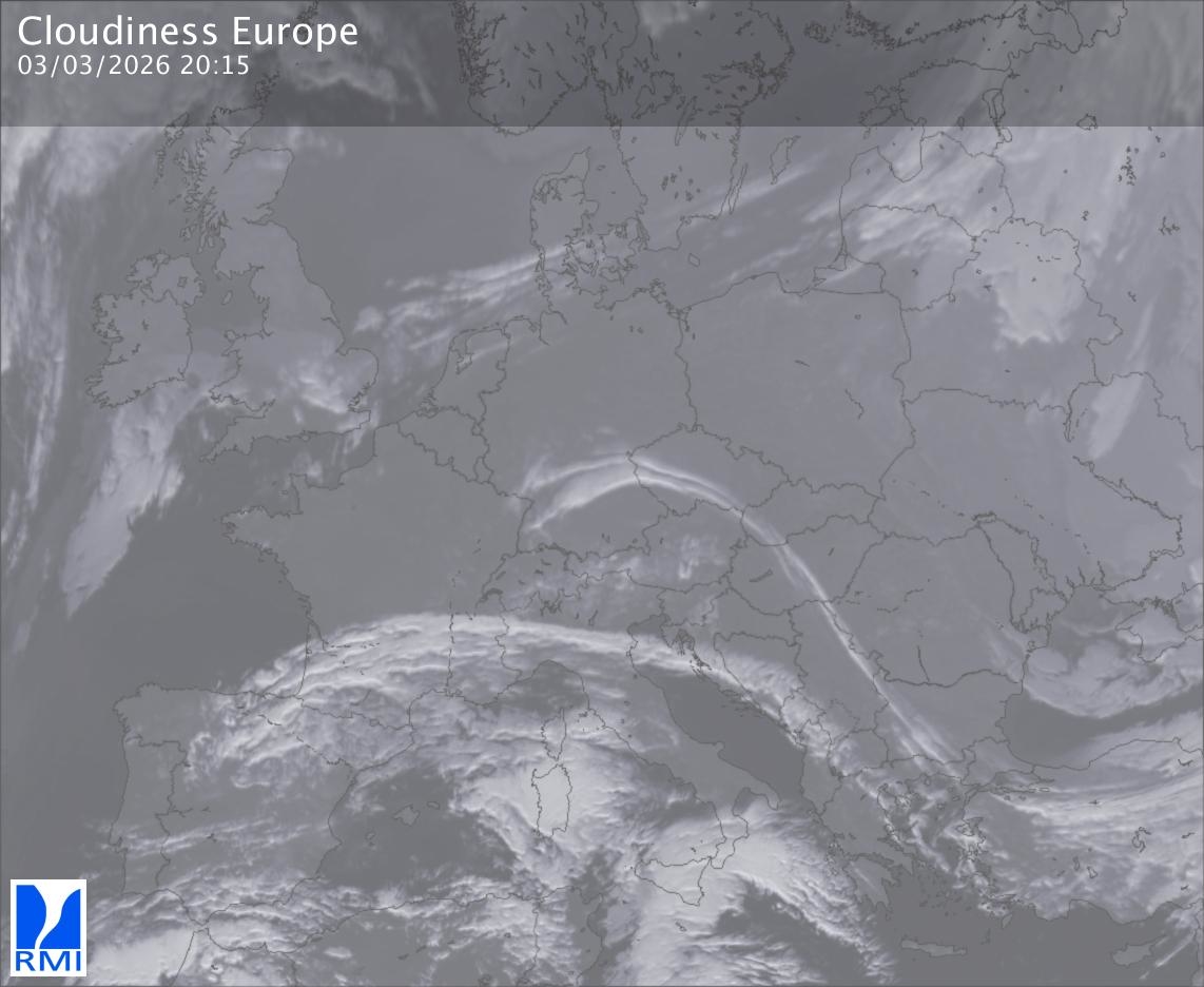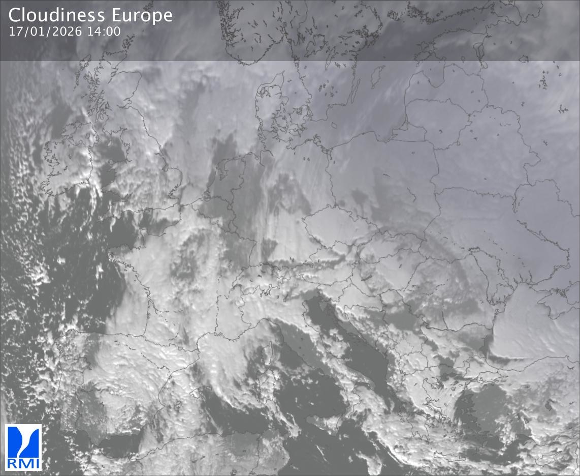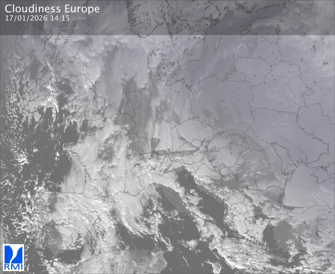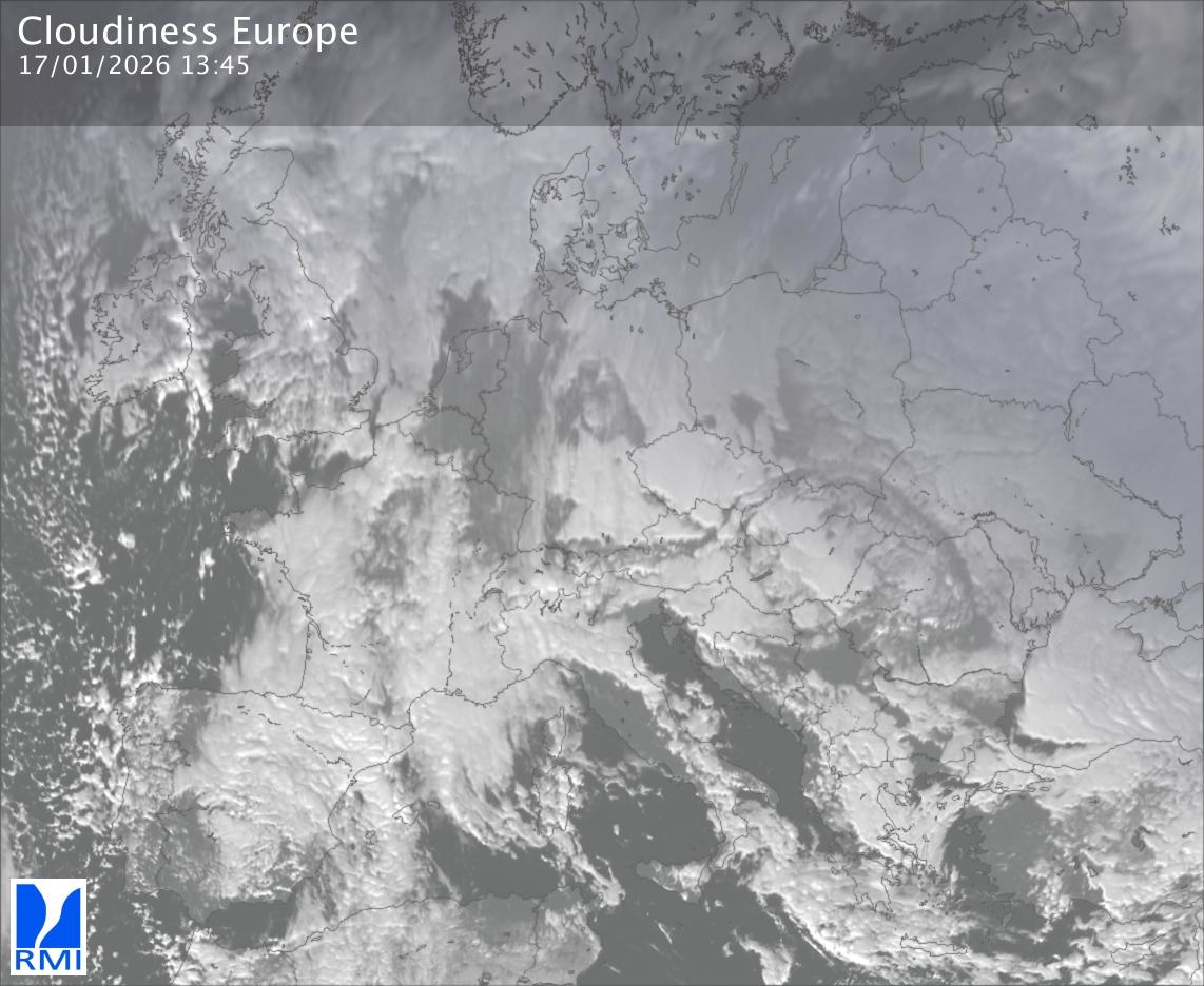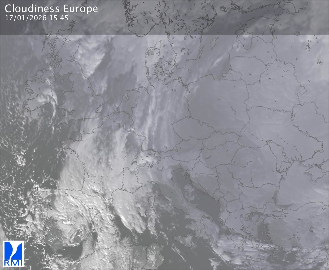 The satellite image of Europe is composed by using both the infrared and the visible light channel from the satellite. Because there are no usable visible light images during the night this composition of channels gives us an image that can be used to observe the clouds by day and by night. The pixelated artifacts are due to the lower resolution of the infrared channel.