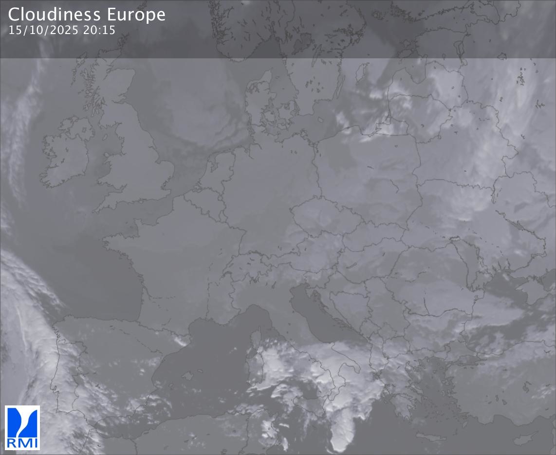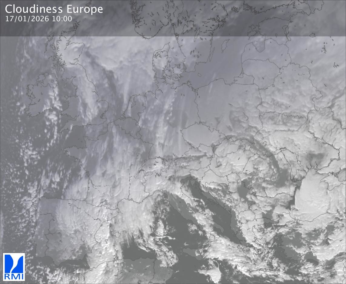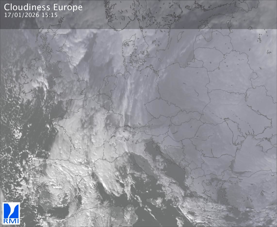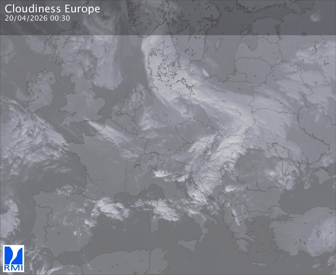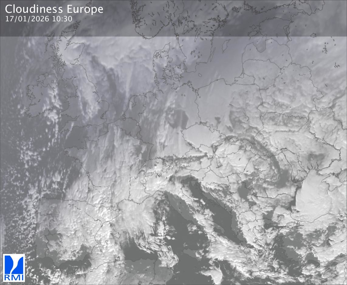 The satellite image of Europe is composed by using both the infrared and the visible light channel from the satellite. Because there are no usable visible light images during the night this composition of channels gives us an image that can be used to observe the clouds by day and by night. The pixelated artifacts are due to the lower resolution of the infrared channel.