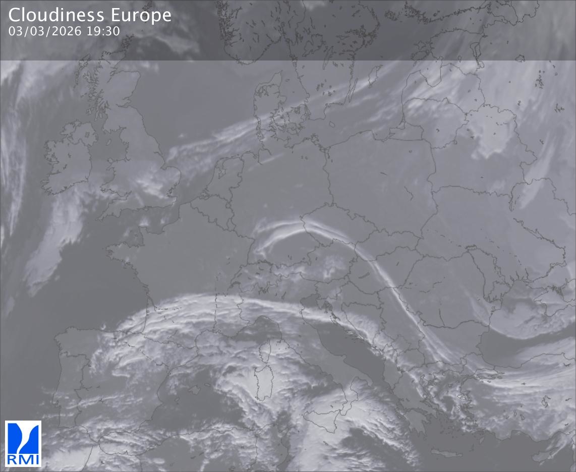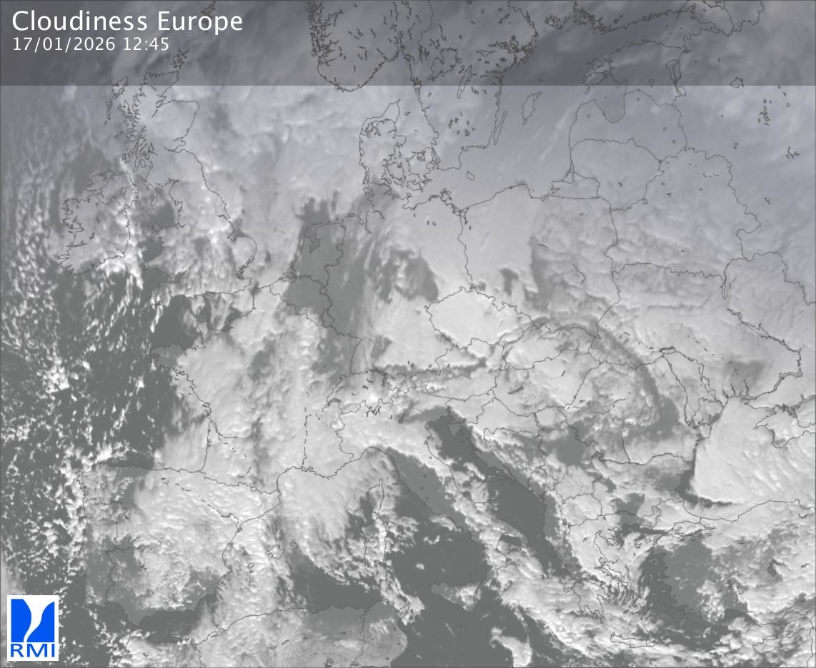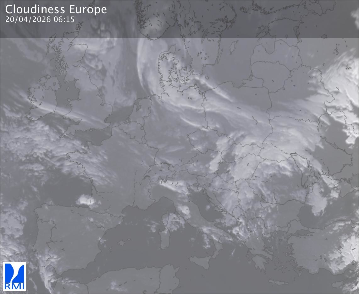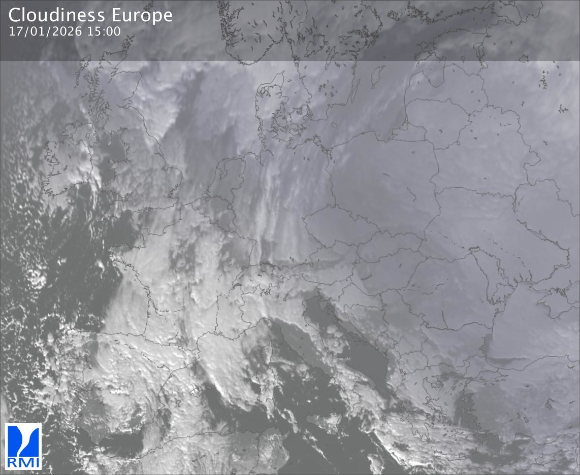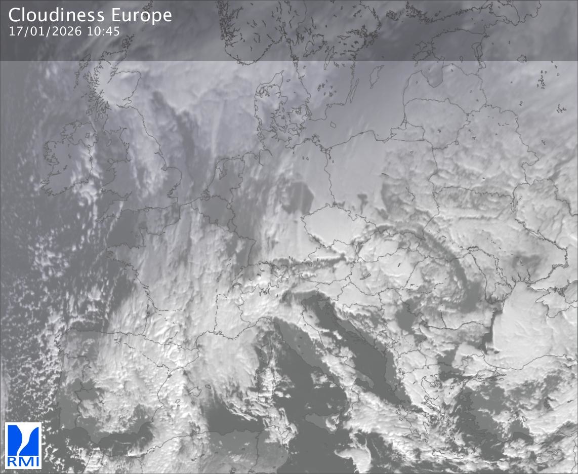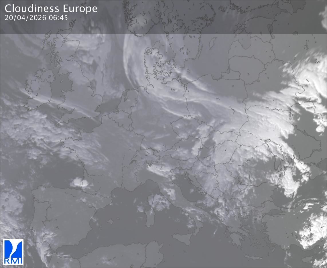 The satellite image of Europe is composed by using both the infrared and the visible light channel from the satellite. Because there are no usable visible light images during the night this composition of channels gives us an image that can be used to observe the clouds by day and by night. The pixelated artifacts are due to the lower resolution of the infrared channel.