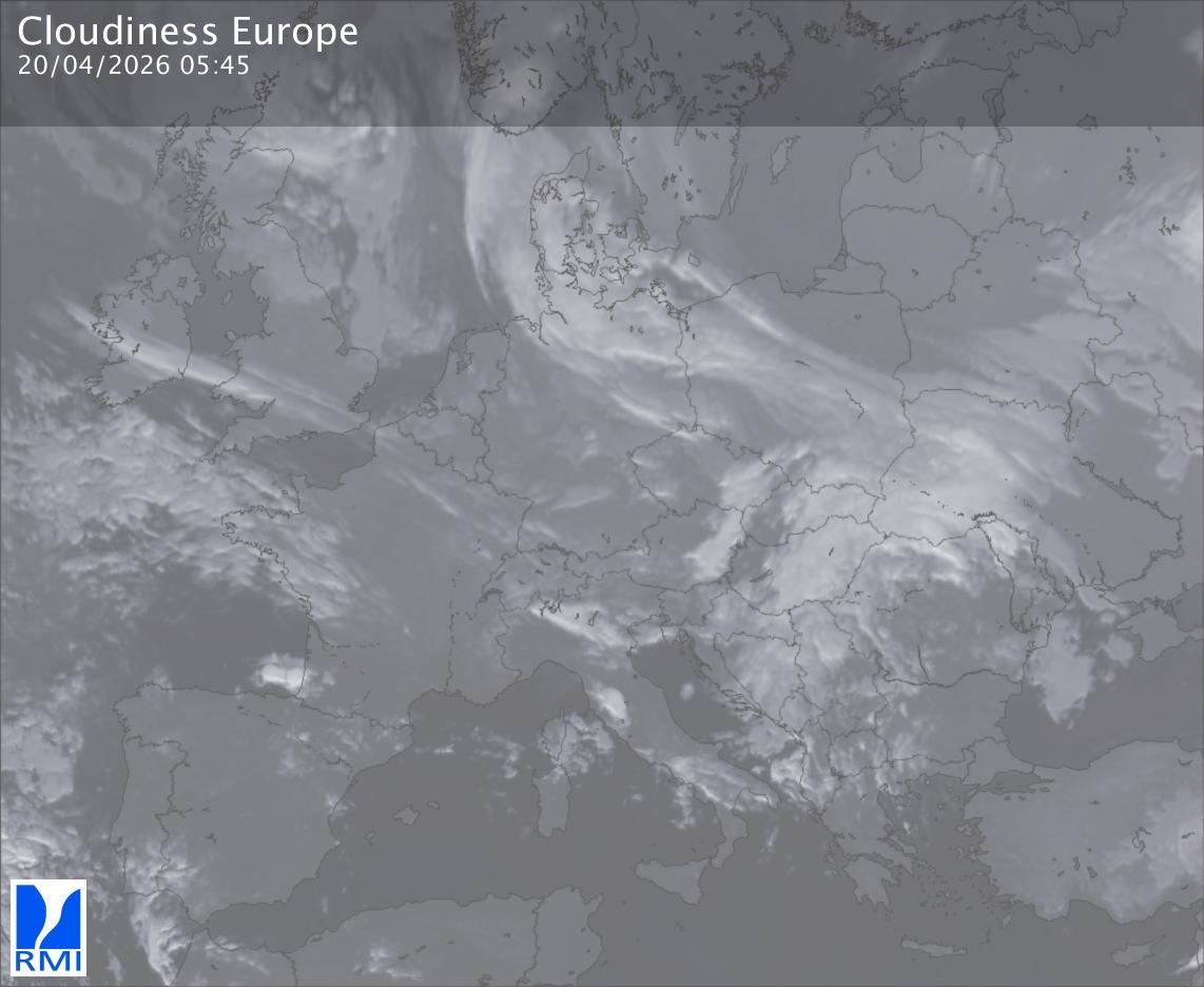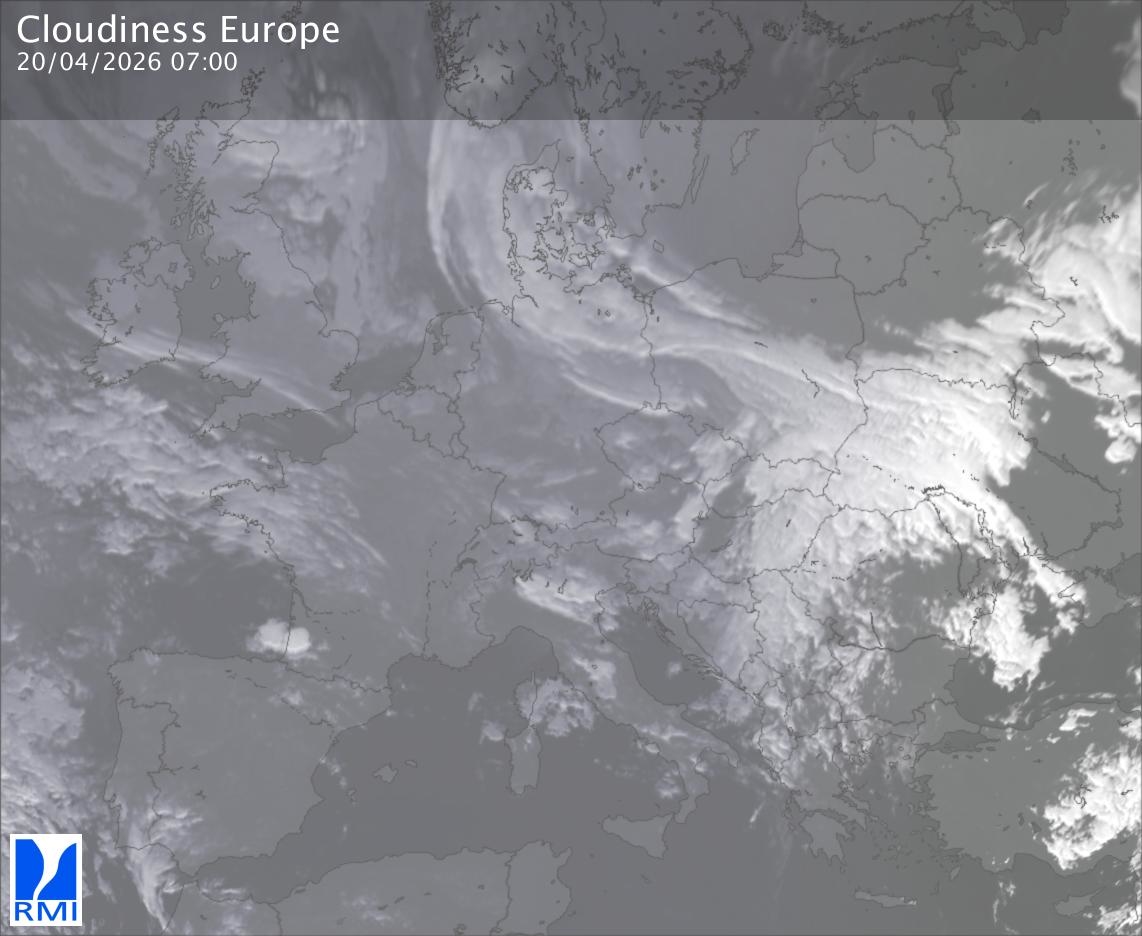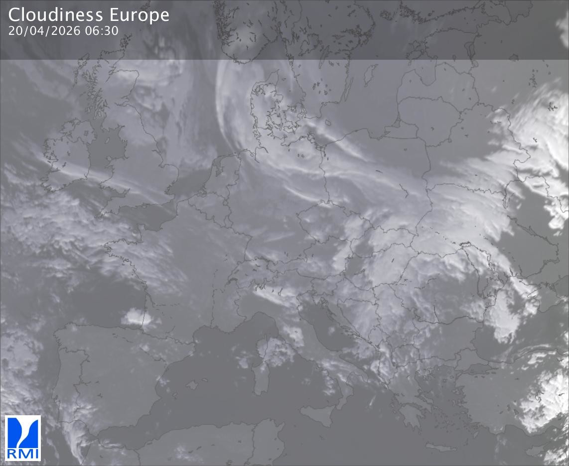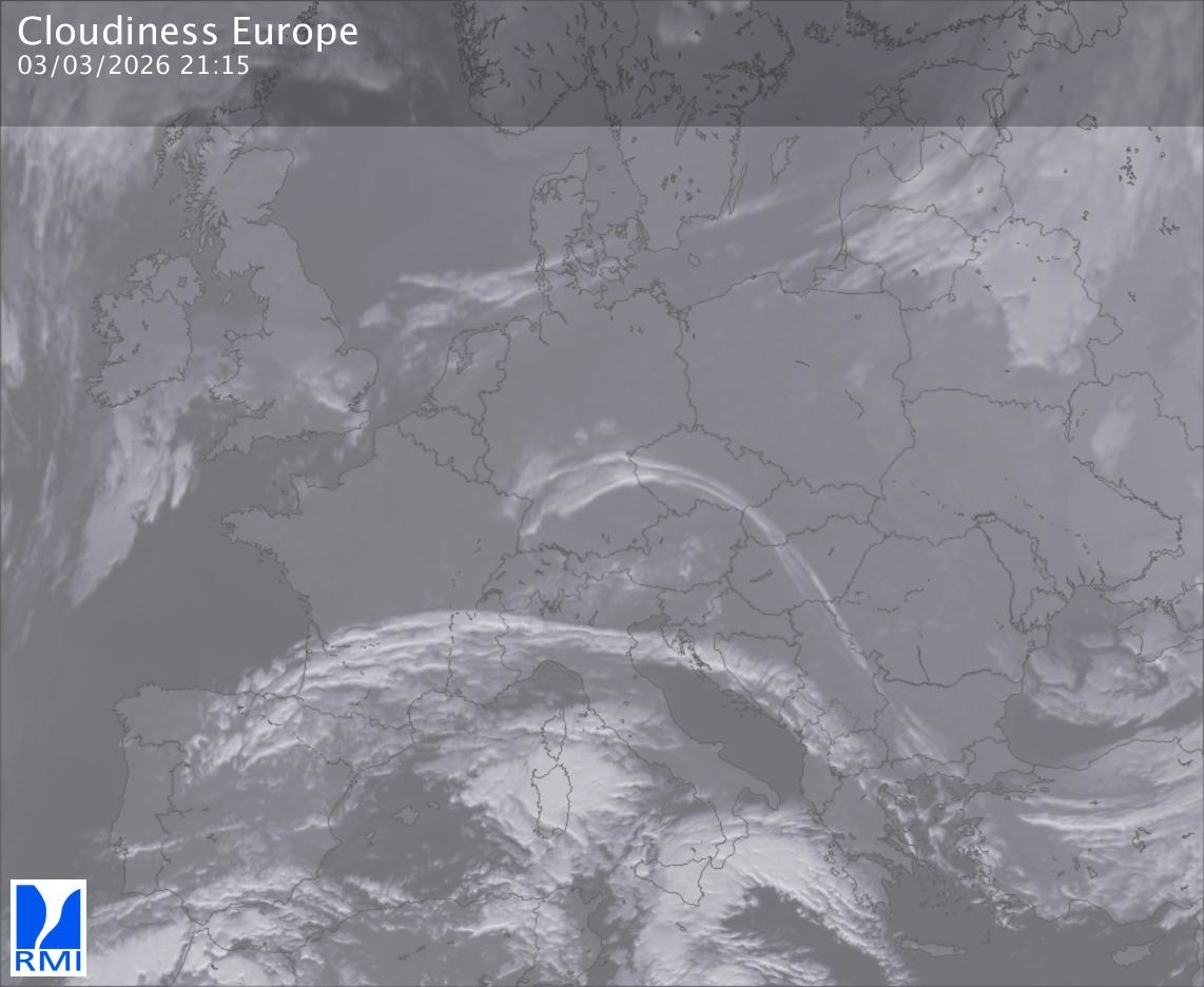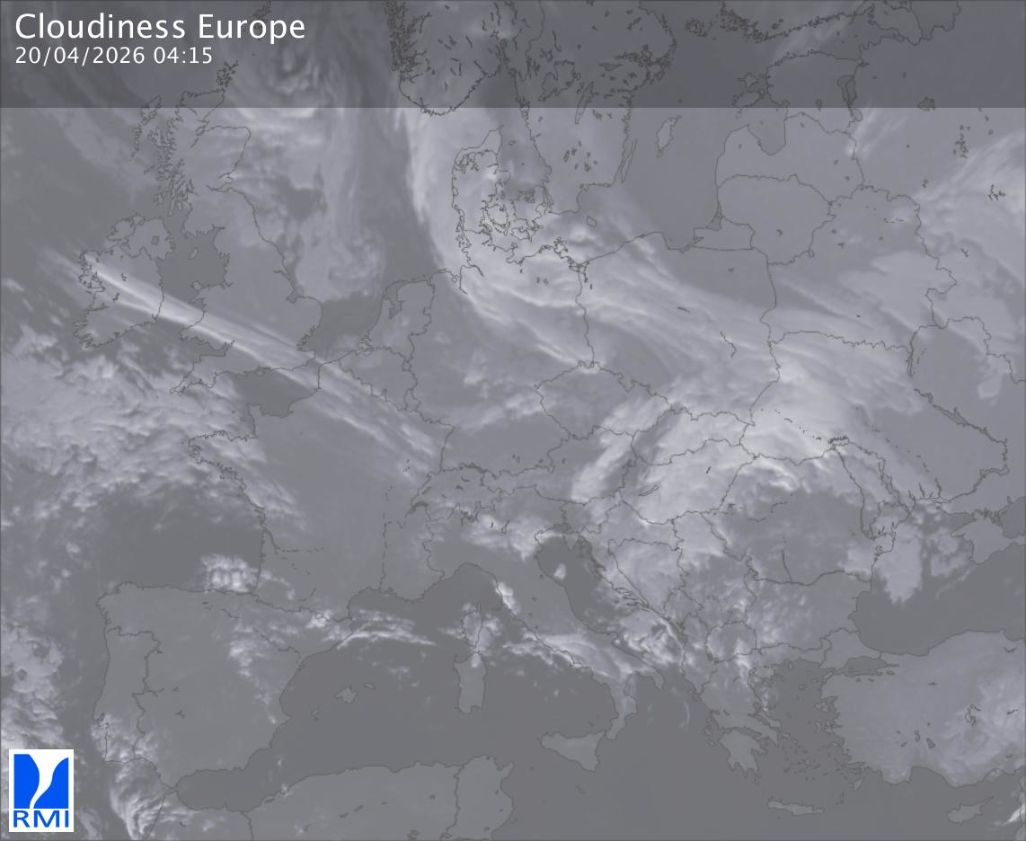 The satellite image of Europe is composed by using both the infrared and the visible light channel from the satellite. Because there are no usable visible light images during the night this composition of channels gives us an image that can be used to observe the clouds by day and by night. The pixelated artifacts are due to the lower resolution of the infrared channel.