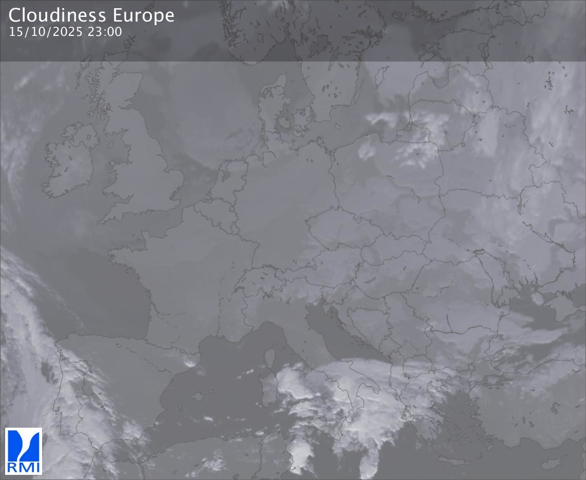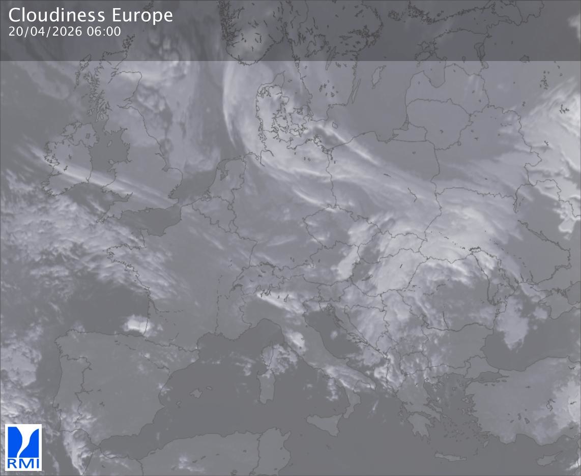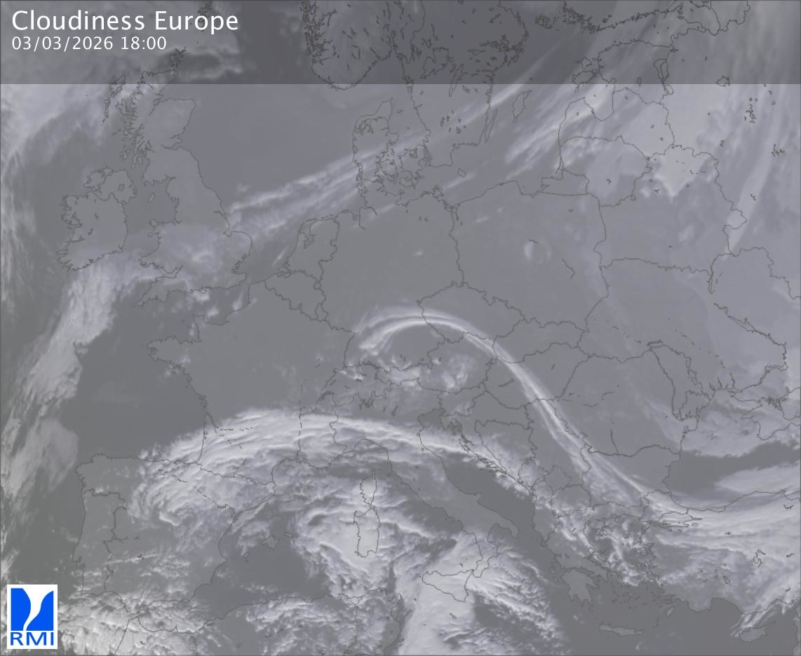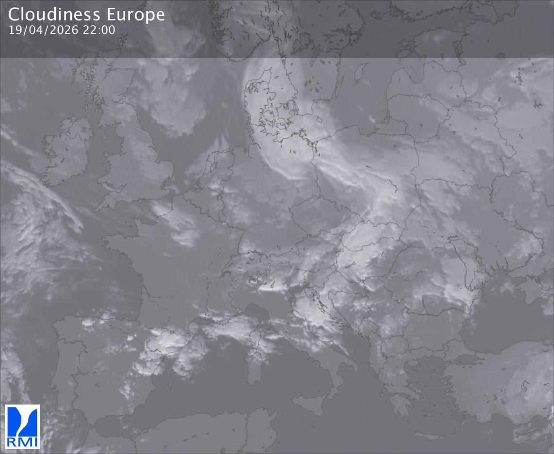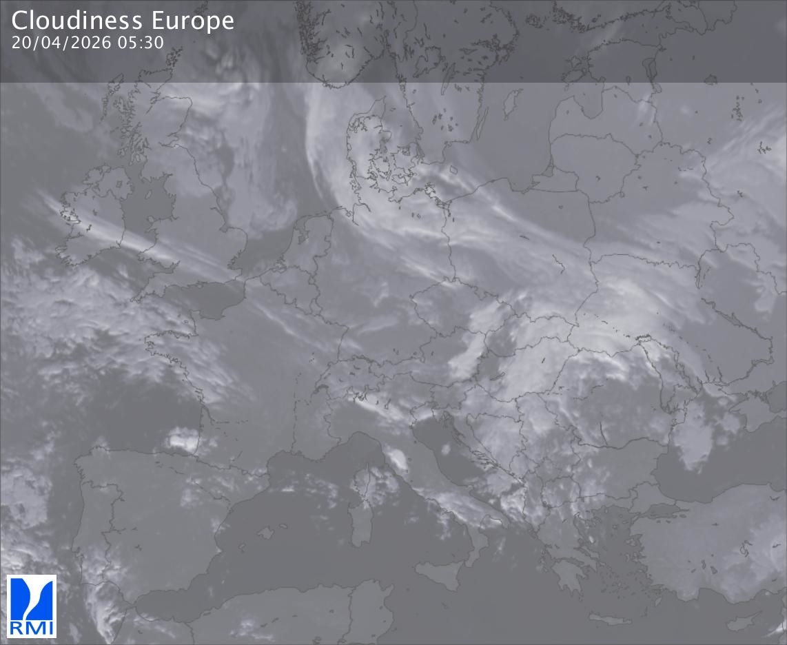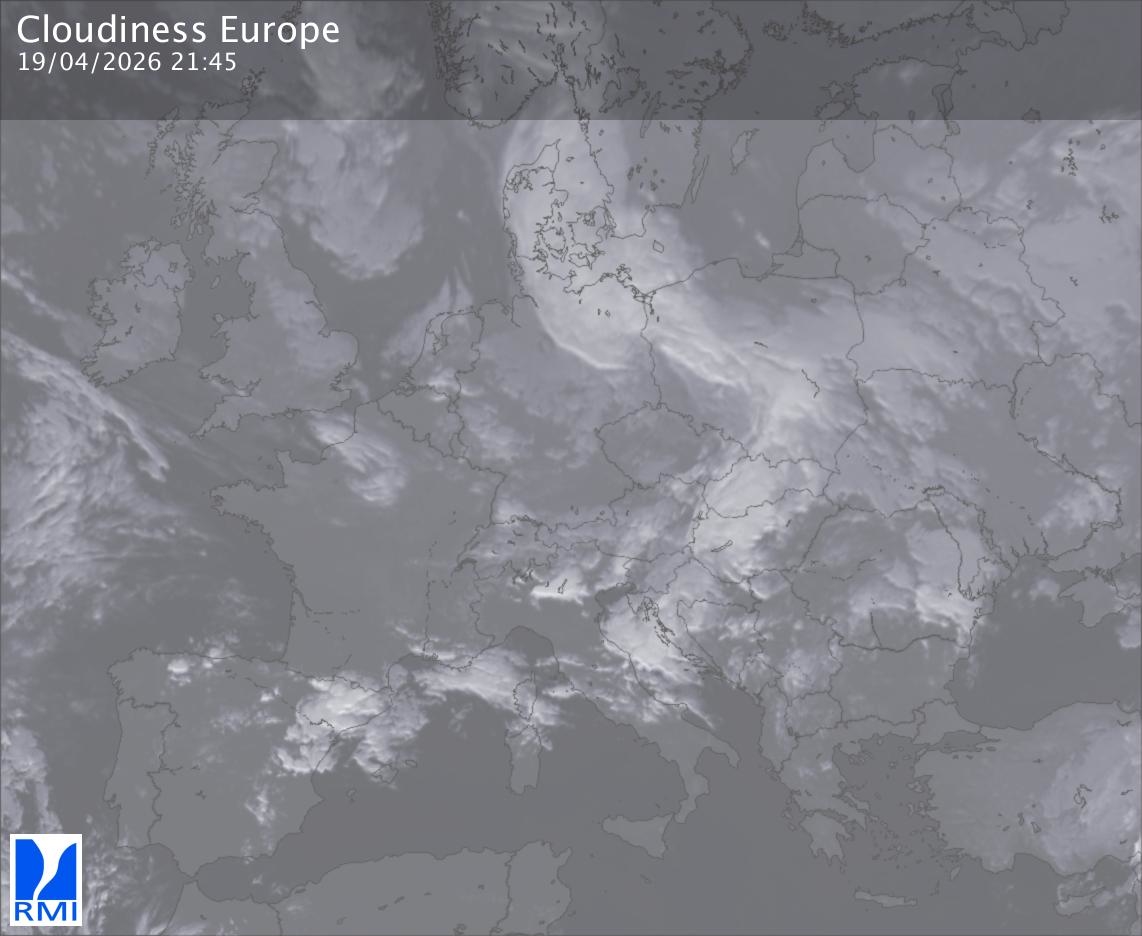 The satellite image of Europe is composed by using both the infrared and the visible light channel from the satellite. Because there are no usable visible light images during the night this composition of channels gives us an image that can be used to observe the clouds by day and by night. The pixelated artifacts are due to the lower resolution of the infrared channel.