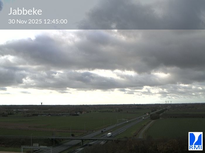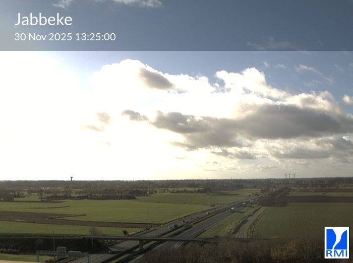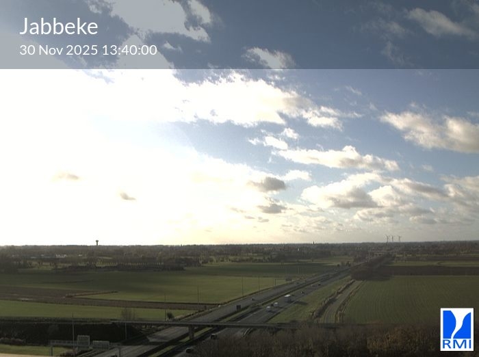 The webcam is located on the tower of the RMI weather radar in Jabbeke at the junction of the E40 highway towards France and the A10 to the coast (Ostend).