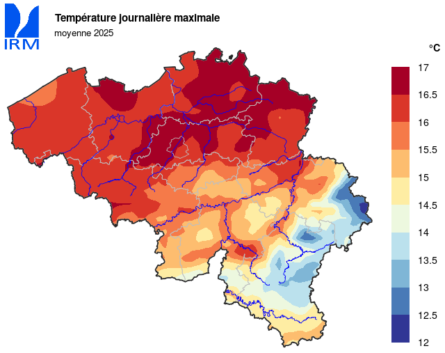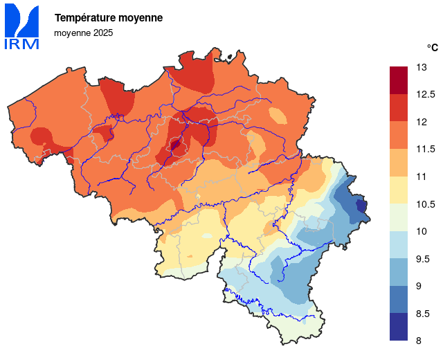 En 2025, la température moyenne à Uccle était de 12,0°C (normale : 11,0°C). Avec cette valeur, l'année écoulée se classe en quatrième position, à égalité avec 2014, juste derrière les années record de 2020 et 2022 (12,2°C) et derrière 2023 (12,1°C) (mesures depuis 1833).