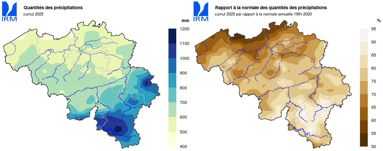 Après l’année 2024 la plus humide jamais enregistrée (1170,7 mm), les précipitations ont diminué de près de moitié en 2025. À Uccle, il n'est tombé que 620,6 mm de précipitations (normale : 837,3 mm) et cette quantité annuelle s'est répartie sur 145 jours (normale : 189,8 jours).