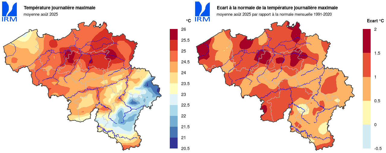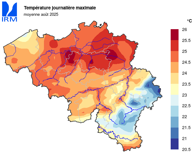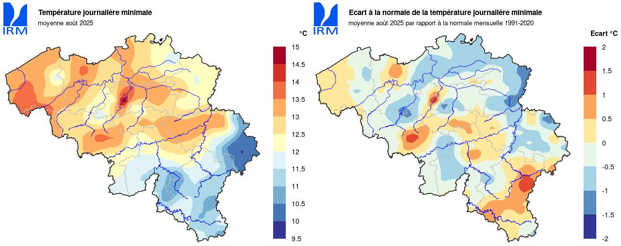 Sur l’ensemble de notre territoire, la température minimale la plus basse a été enregistrée le 25 août à Elsenborn (Bütgenbach) avec 0,6 °C. La température maximale la plus élevée a été enregistrée le 12 août à Dilbeek avec 35,0 °C.