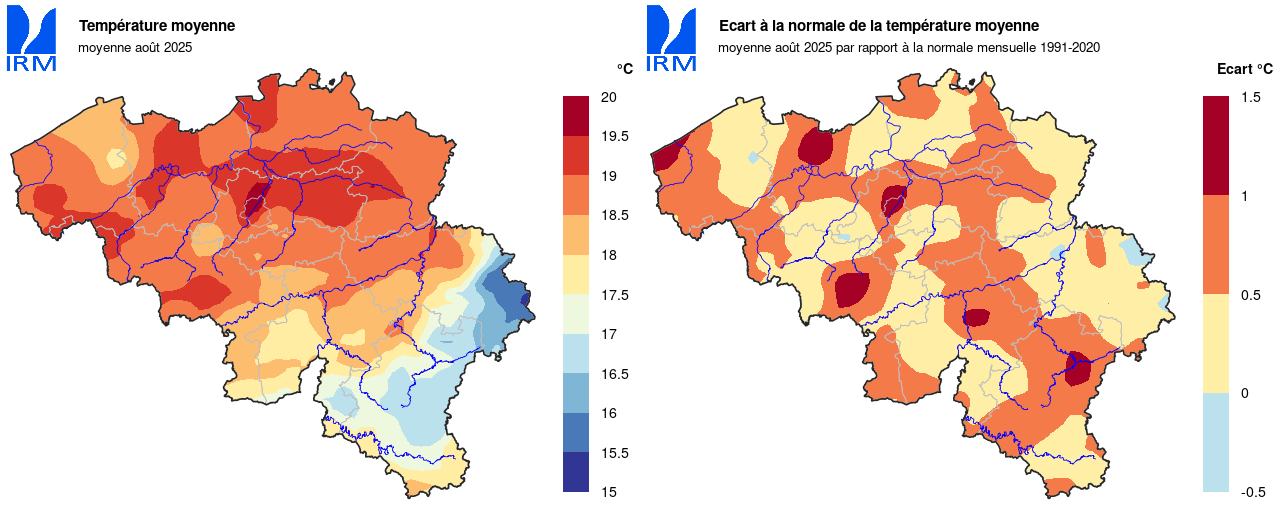 À Uccle, la température moyenne du mois d'août s'est élevée à 19,3 °C (normale : 18,4 °C). Les moyennes des extrêmes de températures sont restées supérieures à leurs normales respectives, surtout durant la deuxième décade et à la fin de la troisième décade.