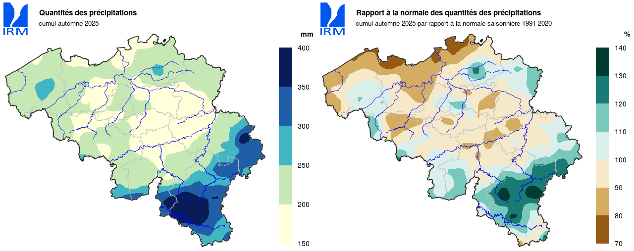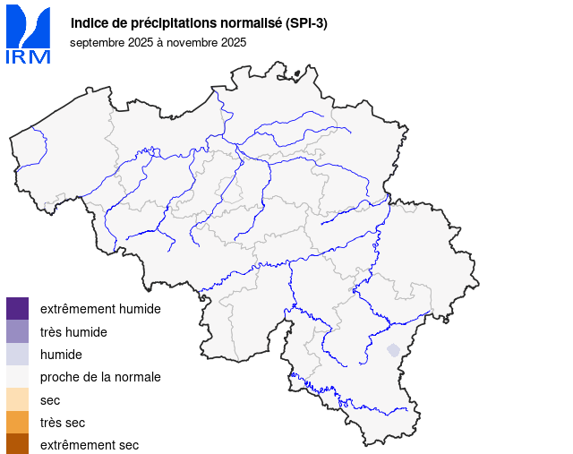 Sur l’ensemble du territoire, les précipitations régionales moyennes ont varié d’environ 85 % de la normale sur la côte et dans les polders à environ 115 % de la normale dans les Ardennes.