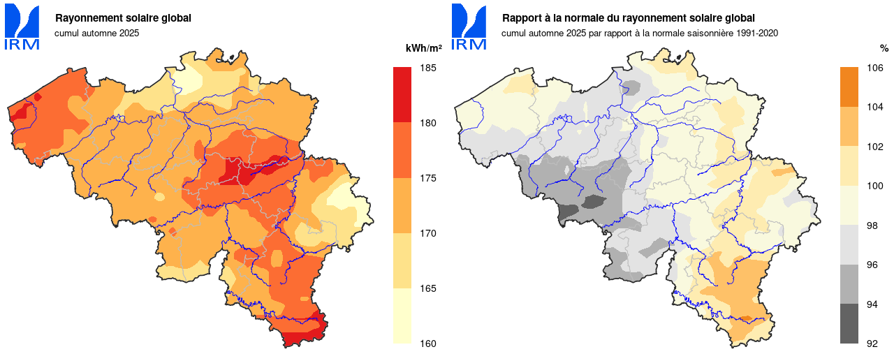 Dans son ensemble, l'automne 2025 a été nettement moins ensoleillé que la moyenne : 249 h 34 min (normale : 332 h 51 min).