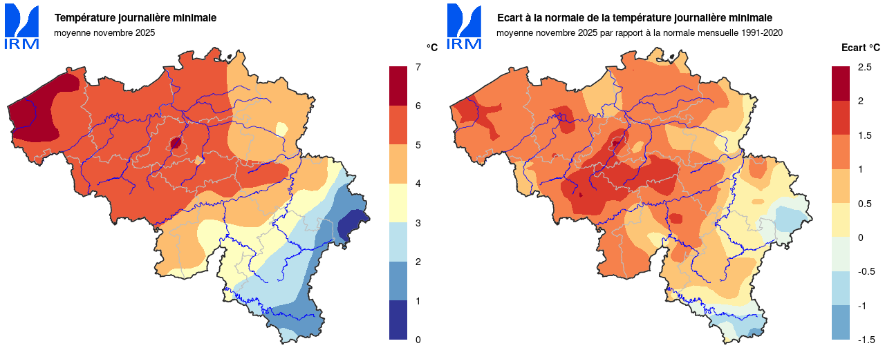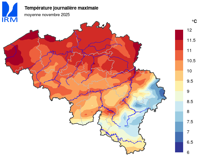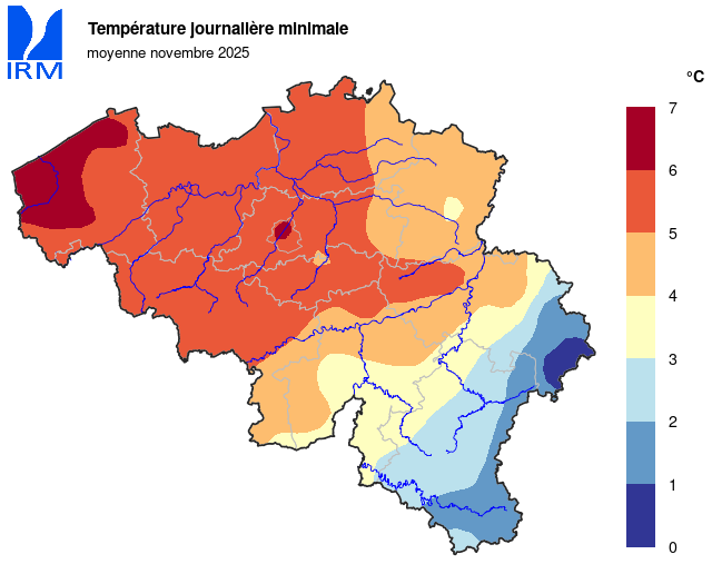 Sur l’ensemble de notre territoire, la température la plus basse a été enregistrée le 23 novembre à Elsenborn (Bütgenbach) avec -11,5°C. Pour le mois de novembre, il s'agit de la température minimale la plus basse enregistrée dans notre pays depuis 1999. La température maximale la plus élevée a été enregistrée le 5 novembre à Kapelle-op-den-Bos avec 20,4 °C.