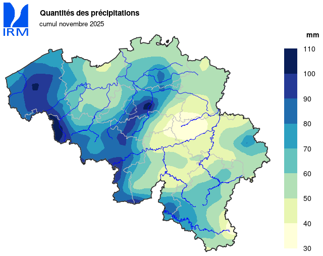Sur l’ensemble du réseau climatologique de l’IRM, le total journalier de précipitations le plus élevé a été mesuré à Braine-l’Alleud le 15 novembre avec un total de 39,1 mm.
