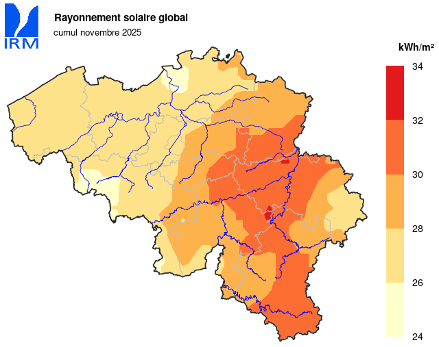 Au cours du mois de novembre, le soleil a brillé durant 59 h 38 min, à Uccle (normale : 65 h 46 min). Ce chiffre est proche de la normale.