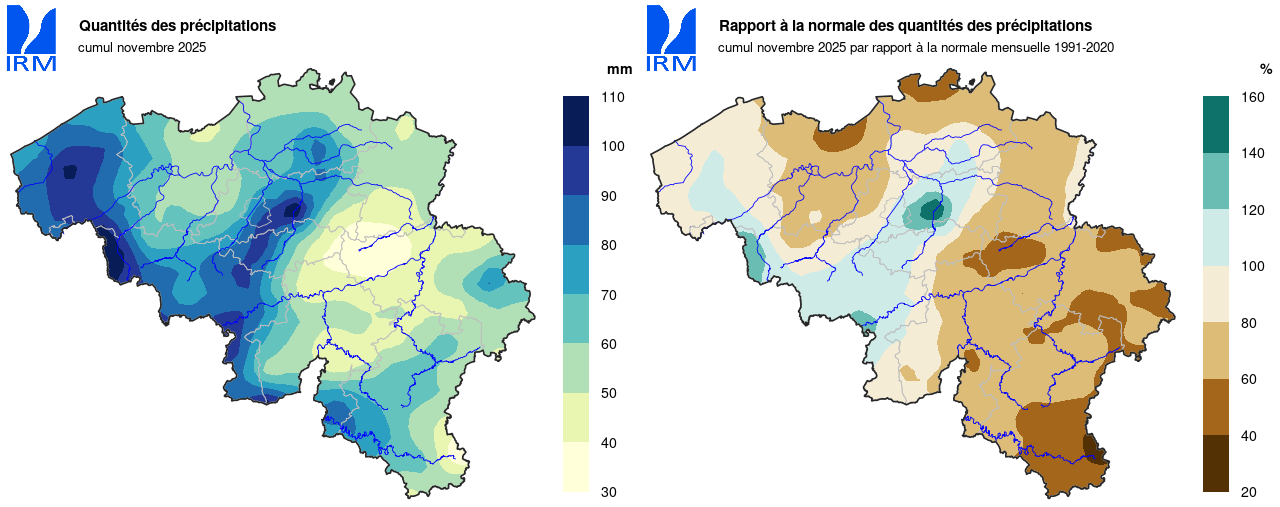 En novembre, Uccle a enregistré 88,8 mm de précipitations (normale : 76,4 mm) réparties sur 17 jours (normale : 18,3 jours). La première moitié du mois a été plus sèche, ce qui a été contrebalancé par une seconde moitié plus humide à Uccle.