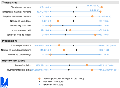 Au cours des 11 derniers mois de 2020, la température moyenne à Uccle a été supérieure à la normale climatologique pendant 10 de ces 11 mois (période de référence 1981-2010). Ce n'est qu'au cours du mois de juillet que la température moyenne mensuelle a été inférieure à la valeur normale. Par exemple, le mois de septembre était en moyenne de 1,5 °C plus chaud que la normale. Le 15 septembre, nous avions eu 34,3 °C à Uccle : la température la plus élevée jamais enregistrée ici pendant un mois de septembre et, de plus, une température aussi élevée de plus de 30 °C n'avait jamais été observée aussi tardivement dans l'année à Uccle.