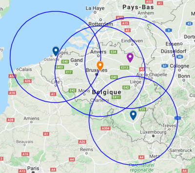 La carte ci-dessous montre la position des quatre radars belges (bleu: radars de l'IRM; orange: radar de Skeyes; mauve: radar de la VMM). Les cercles autour des radars indiquent une portée de 100 km. La portée maximale du radar est plus grande mais on estime généralement que la mesure quantitative des précipitations se dégrade au-delà de cette distance.