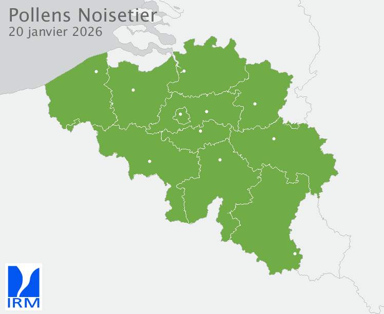 Les informations sur les allergies aux pollens et le rhume des foins attendus sont basées sur le modèle de transport du pollen SILAM. Le modèle de base provient de l'Institut météorologique finlandais. En collaboration avec Sciensano, l'IRM a adapté ce modèle spécifiquement pour la Belgique. Le département Mycologie et Aérobiologie de Sciensano dispose de décennies d'observations polliniques en Belgique et aide à élaborer le modèle pollinique et l'estimation du risque d'allergie au pollen.