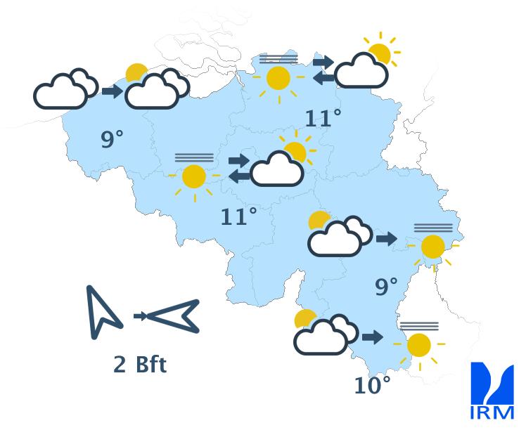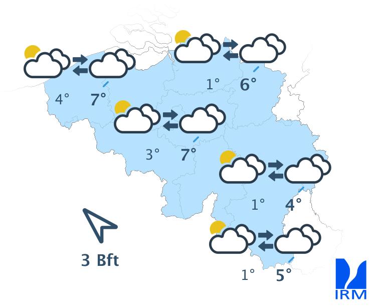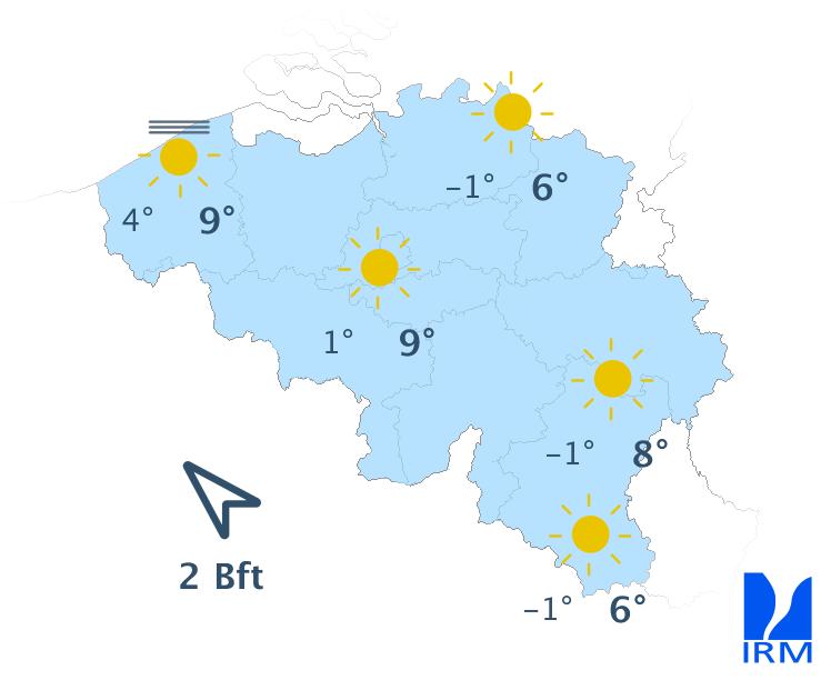Demain matin, nous prévoyons un temps assez lumineux avec toutefois encore des champs nuageux de haute ou moyenne altitude. L'après-midi, ces derniers deviendront graduellement moins denses avec alors des conditions ensoleillées sur la majeure partie du territoire. Les maxima se situeront entre 6 ou 7°C sur le flanc est du relief de l'Ardenne et 9 ou 10°C de la Hesbaye à l'ouest du Hainaut, sous un vent d'est généralement faible, à parfois modéré sur les hauteurs exposées de l'est du territoire.