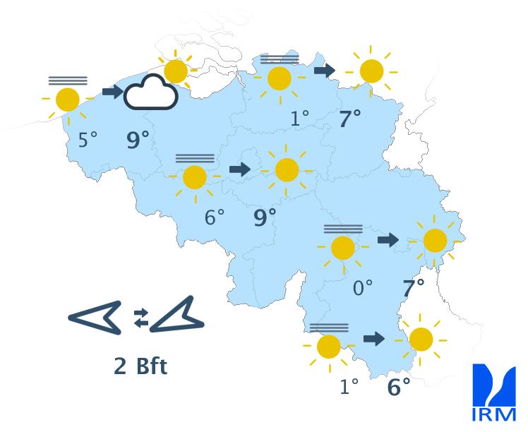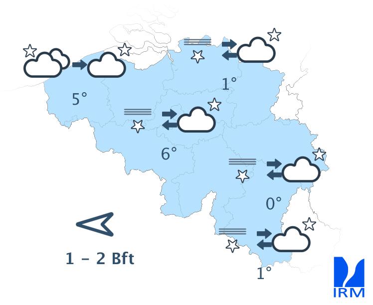 Ce soir, les derniers nuages bas quitteront l'ouest de la Flandre où l'atmosphère deviendra parfois brumeuse. Le ciel restera globalement peu à partiellement nuageux sur l'ensemble du territoire avec essentiellement des nuages de haute ou moyenne altitude. Dans le courant de la nuit, des bancs de brouillard se formeront dans certaines vallées. Les minima seront compris entre localement 0 ou -1°C en Ardenne et 6 ou 7°C dans certains grands centres urbains, sous un vent de secteur est-nord-est à est-sud-est généralement faible, à parfois modéré sur les hauteurs exposées de l'est du pays.