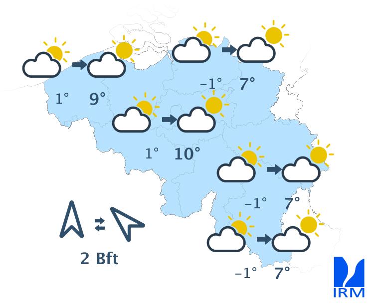 Lundi, des périodes ensoleillées alterneront avec des passages nuageux. Le temps sera généralement sec. Après une nuit froide avec des gelées en Ardenne et par endroits aussi dans le centre, les températures maximales s'échelonneront entre 4 et 10 degrés. Le vent sera faible de secteur sud à sud-est.