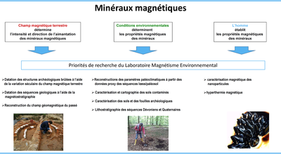 Le magnétisme environnemental est lié au fait que le fer est l’un des éléments chimiques les plus communs dans la croûte terrestre. Il forme en association avec le soufre et l’oxygène des minéraux magnétiques présents universellement. Le Laboratoire Magnétisme Environnemental suit trois lignes d’activité scientifique: