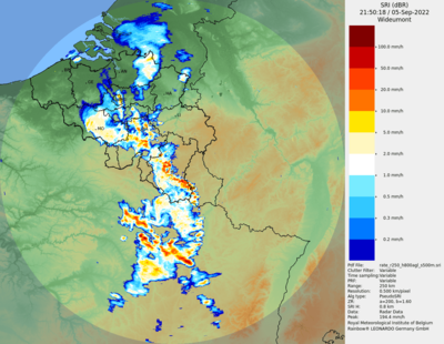 Intense neerslag waargenomen door de weerradar van Wideumont.