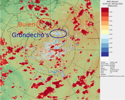 Het beeld hierboven werd gemaakt tijdens een periode met buien en toont de correlatie tussen de echo's van de horizontale en de verticale polarisatie binnen een straal van 100 km rond de radar. De gebieden in het rood, die worden gekenmerkt door zeer hoge correlaties, komen overeen met de locaties van de buien. De blauwe gebieden met lage correlaties duiden op echo’s afkomstig van de grond. De blauwe ellips markeert bijvoorbeeld echo’s die door het plateau rond de Baraque de Fraiture worden weerkaatst. Grondecho's hebben een heel andere signatuur dan echo’s van neerslag, en kunnen daardoor gemakkelijker worden verwijderd van de neerslagbeelden. Bij de vorige radar hadden we deze mogelijkheid niet.