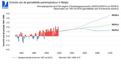 Evolutie van de gemiddelde temperatuur in België (ten opzichte van de normale 1961-1990) voor de periode 1951-2100. De lijnen stemmen overeen met het verloop van de geobserveerde temperaturen in het verleden. Voor de toekomst tonen ze het verloop van de gemodelleerde temperaturen volgens verschillende broeikasgasscenario’s. De verticale rode en blauwe balken zijn de geobserveerde jaargemiddelden tot 2018.
