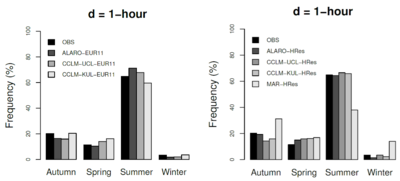 Algemeen tonen de resultaten in onderstaande figuren dat de modellen met veel ruimtelijk detail of met een hoge ruimtelijke resolutie de waargenomen neerslagextremen in België goed simuleren. De modellen met een hoge ruimtelijke resolutie geven bijvoorbeeld de waargenomen neerslagextremen van korte duur (uurlijkse neerslag) beter weer in vergelijking met de modellen met een lagere resolutie.