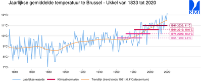 De klimaatverandering is het sterkst zichtbaar in de temperatuur. Zo toont de figuur hieronder de evolutie van de jaarlijkse gemiddelde temperatuur in Ukkel sinds 1833 samen met de vier laatste normaalwaarden sinds 1961 (horizontale roze en rode lijnen). Het is duidelijk dat sinds de jaren 1970 de gemiddelde temperatuur in Ukkel onafgebroken is toegenomen, met momenteel een gemiddelde opwarming van 1,2°C t.o.v. 1961-1990.