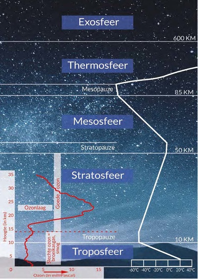 Verticale verdeling van ozon (rode lijn) en temperatuur (witte lijn) volgens de hoogte in de atmosfeer