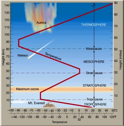 In de mesosfeer (50 tot 80 km hoogte) daalt de temperatuur weer snel tot -90°C, terwijl hij in de hogergelegen thermosfeer opnieuw snel oploopt.