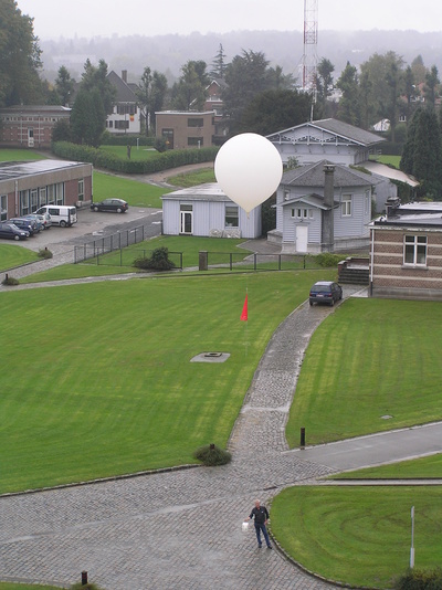 Door middel van een ballon wordt een radiosonde opgelaten in de lucht.