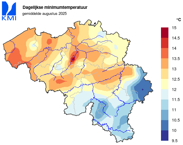 In de rest van ons land werd de laagste minimumtemperatuur op 25 augustus in Elsenborn (Bütgenbach) gemeten met 0,6°C. De hoogste maximumtemperatuur werd op de 12de in Dilbeek geregistreerd met 35,0°C.
