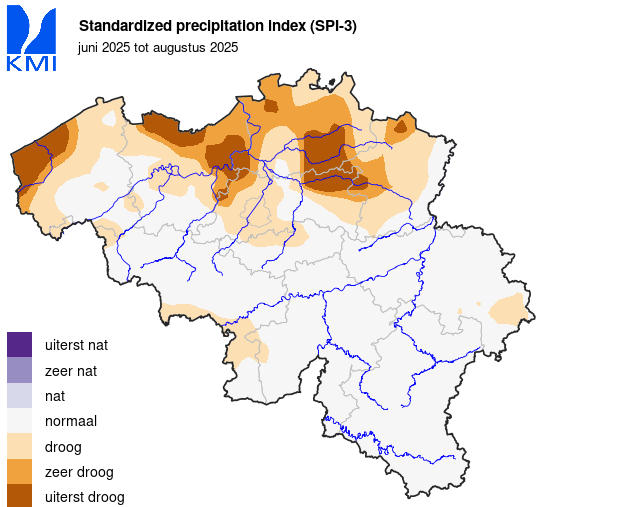 Vooral de tweede (11-20 augustus) en derde decade (21-31 augustus) van augustus waren zeer droog. Er viel toen slechts respectievelijk 0,5 mm en 3,3 mm neerslag. Voor de huidige referentieperiode waren enkel de tweede decade van 2012, 1997 en 1995 nog droger (0 mm). Voor de derde decade waren enkel deze van 2022 (0 mm), 1999 (0,2 mm) en 2000 (2,3 mm) nog droger.
