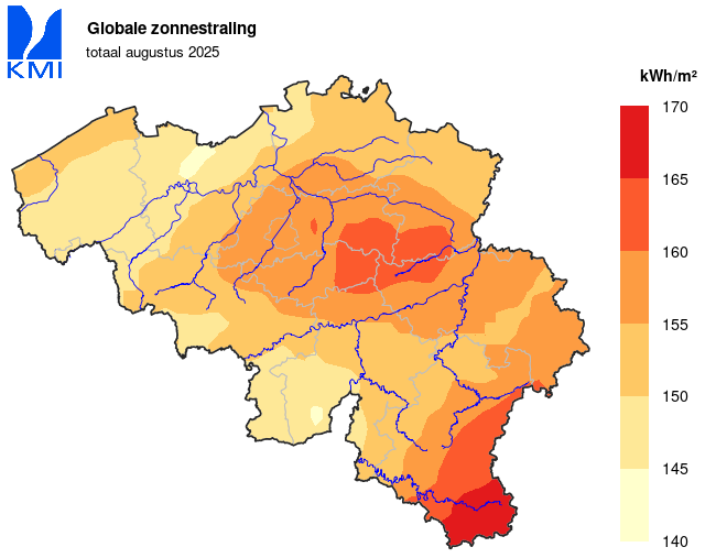 De maand augustus was zonniger dan gemiddeld: 233u 32min (normaal: 192u 26min). Vooral de tweede decade viel op: met een zonneschijnduur van 98u 03min was dit de derde zonnigste tweede augustusdecade van de huidige referentieperiode. Enkel 1997 (met 110u 50min) en 1995 (101u 20min) waren nog zonniger.