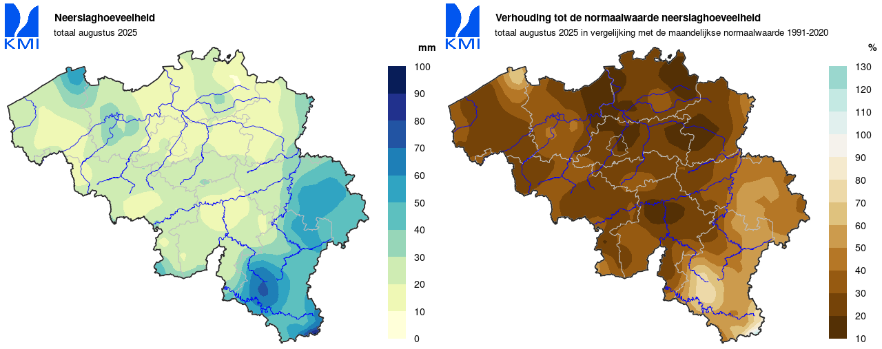 In ons land lagen de maandelijkse neerslagtotalen overal ver onder de normalen. In de meeste regio’s viel er slechts 25% tot 30% van de normale hoeveelheid neerslag. De meeste neerslag viel in Belgisch Lotharingen (ongeveer 64% van de normale hoeveelheid).