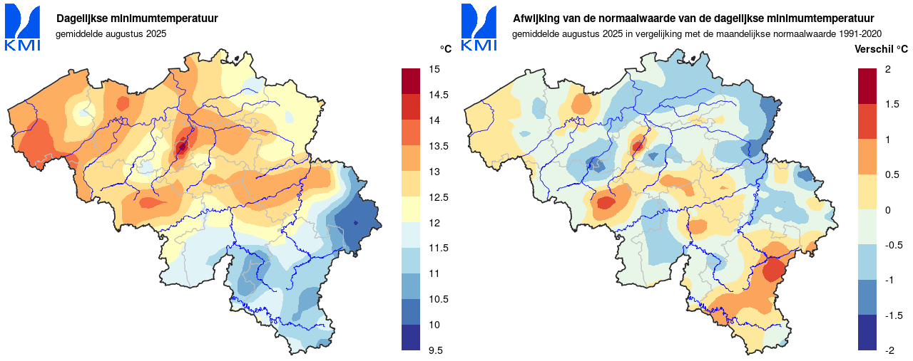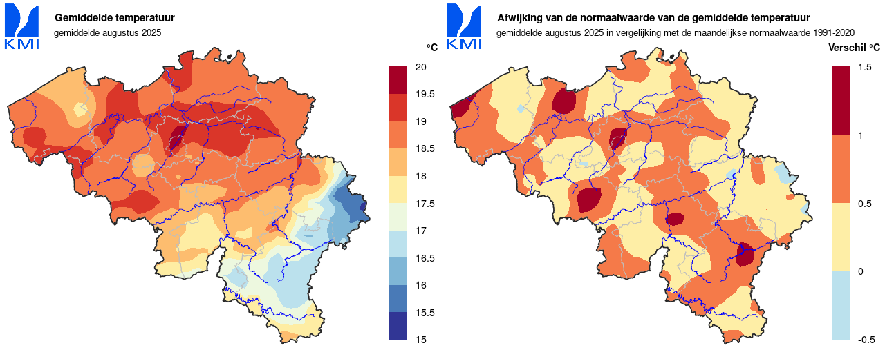 Ook de gemiddelde maximumtemperatuur lag met 24,3°C boven de normale waarde (23°C) terwijl de gemiddelde minimumtemperatuur (14,1°C) slechts lichtjes afwijkt van de normale waarde (13,9°C).