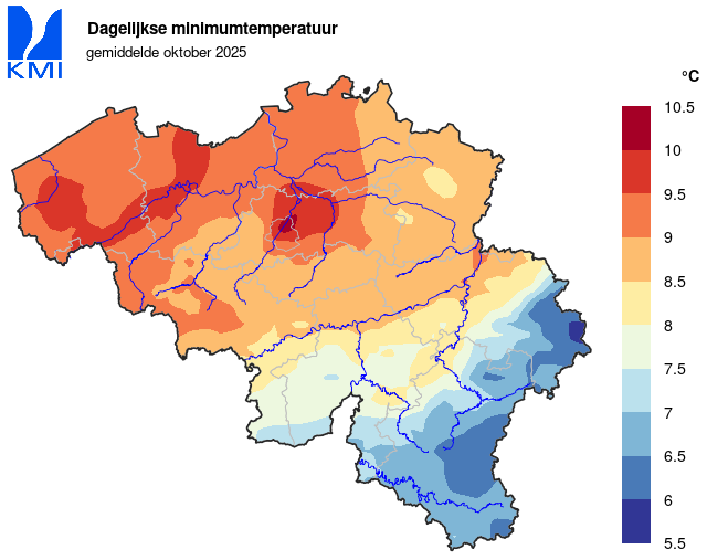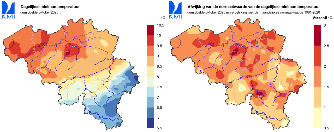 In de rest van ons land werd de laagste minimumtemperatuur op 2 oktober in Elsenborn (Bütgenbach) gemeten met -1,6°C. De hoogste maximumtemperatuur werd op de 1ste in Zulzeke (Kluisbergen) geregistreerd met 20,1°C.