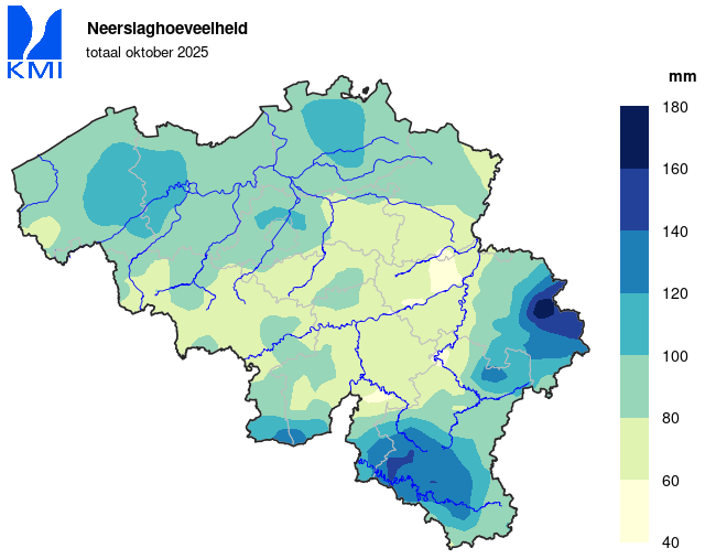 In het klimatologisch meetnet van het KMI werd het grootste dagtotaal (33,2 mm) op 20 oktober in Frassem (Arlon) en op 23 oktober in Rossignol (Tintigny) gemeten.